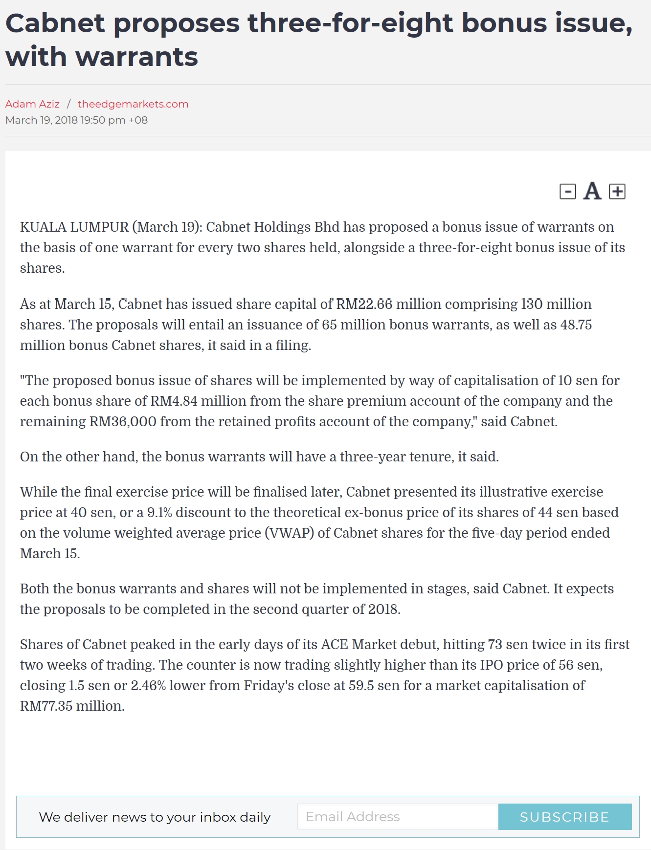 Cabnet proposes three-for-eight bonus issue, with warrants